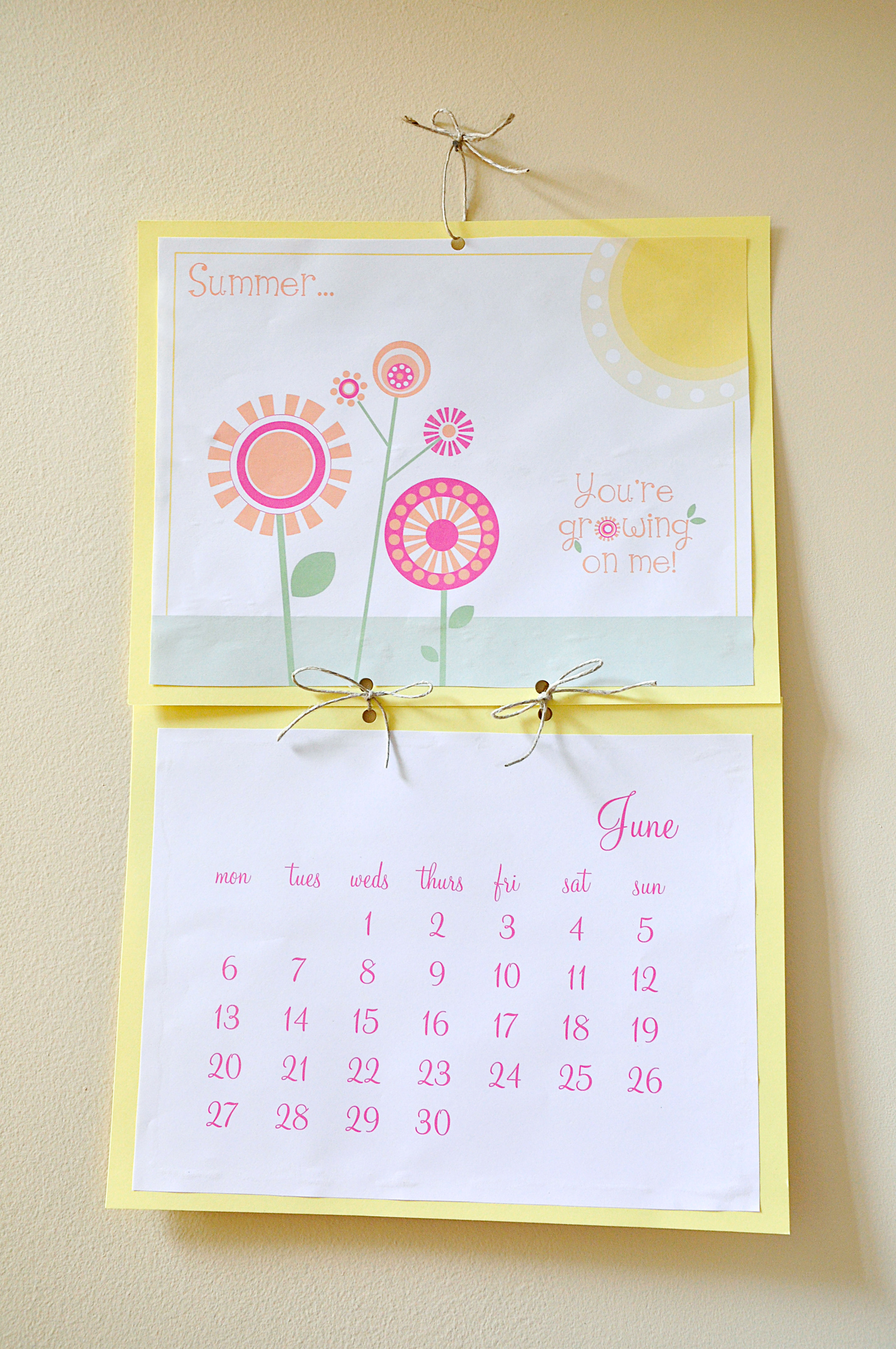 Here in NC, the temps are already almost reaching 100 degrees!  I think summer has officially arrived :)  Here’s another design completed for the girls’ school room calendar.  They are in love with the colors!  Excuse the wrinkly final product… that’s what you get for letting little kids help you put it together! Ha!  Feel free to download the design and use it for your own project!  Just print out the designs on plain white paper (or white cardstock if you have it) and then glue them on some brightly colored cardstock!  Finish off with some twine or string and you have a quick, easy project!