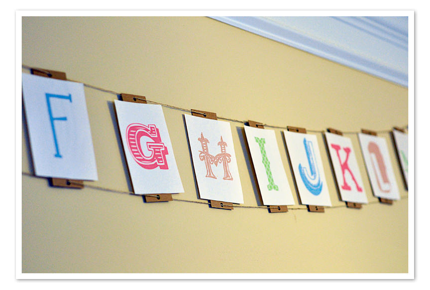It really is hard to believe that summer vacation is over and it’s time to hit the books again!  We have been getting our school room ready in preparation for a fresh start.  The wee women are heading into first grade and kindergarten!  I wanted to have the alphabet up on the wall, so I decided to design some fun letters to string together.  Because of their size, they are also going to make some great flash cards!