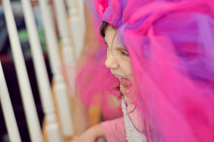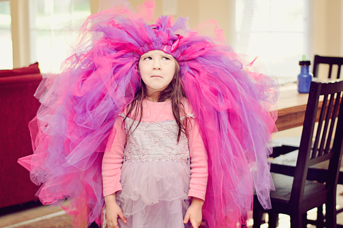 It’s the silliest things around here that get the biggest laughs! Simple fun! And who couldn’t use a dual purpose for a huge, poofy tutu? This simple idea turned my sweet 5 year old into a “monster” that chased around her siblings while they screamed their heads off. I think Daddy got a video for posterity’s-sake. As you can imagine, this was totally *not* a posed photo… and I couldn’t stop laughing as the elastic from the tutu continued to squish her eyebrows down! She though it was hilarious too and totally used that as part of her “look”.
